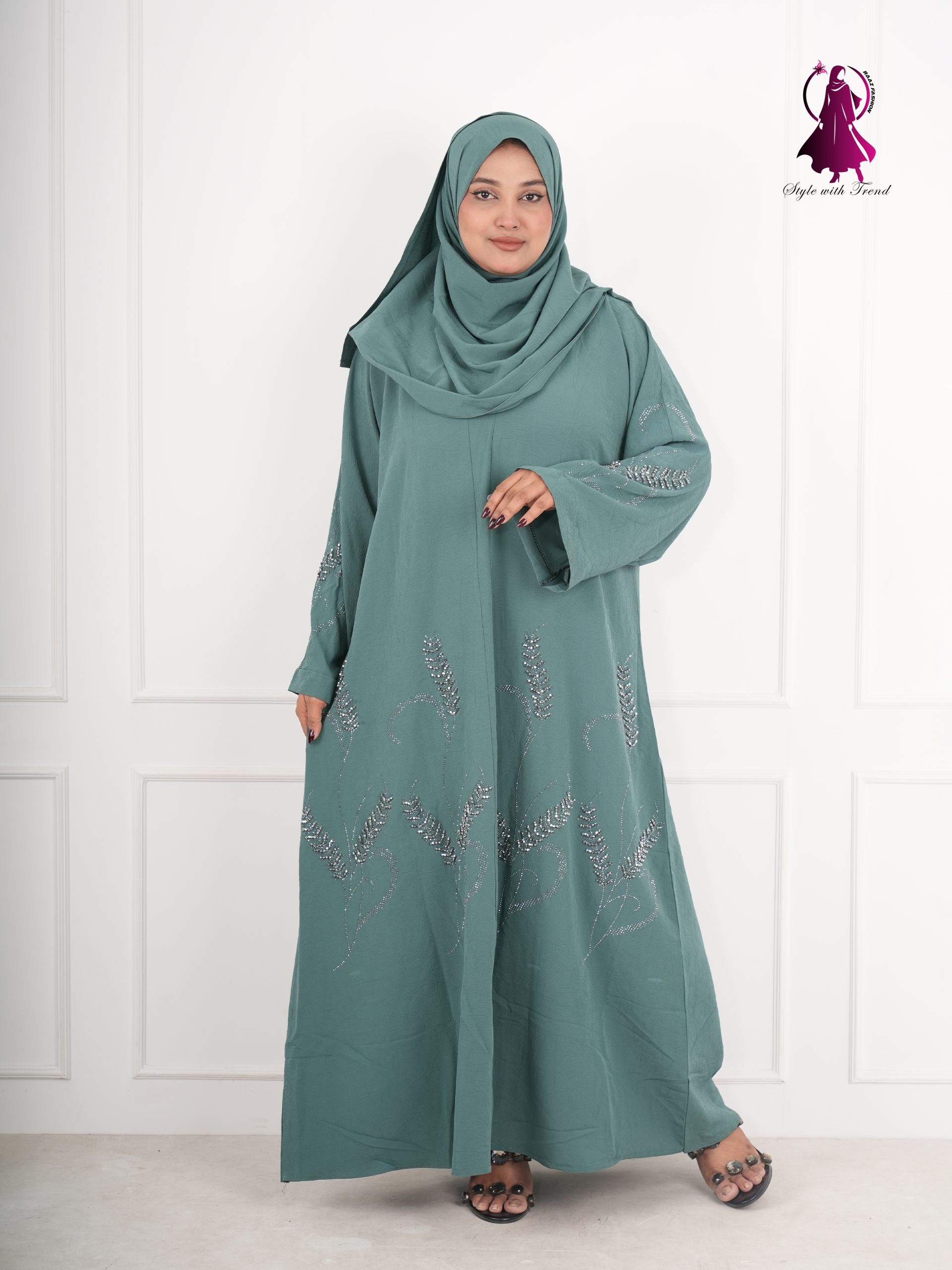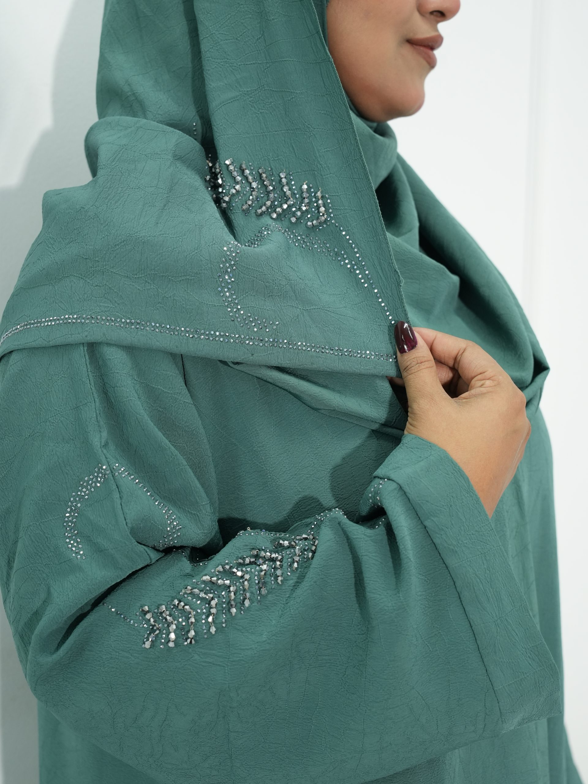 Elegant Hijab: সাথে থাকছে ম্যাচিং হিজাব, যাতে স্টোন ওয়ার্কের পাশাপাশি কারচুপির কাজও রয়েছে।